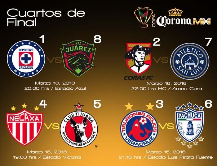 Futbol, Copa MX, 14 de Marzo 2016-. Se recortó la lista de equipos que buscarán alzar la Copa MX del Clausura 2016, ocho fueron los que lograron avanzar a la fase de cuartos de